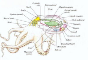 The nervous system for an Octopus is controlled by the brain, and it is very complex in nature. What is very interesting is that they don’t have any organs for hearing. The octopus is an animal that is deaf. They have a sac where the ink is produced when they need to release it and escape from danger.